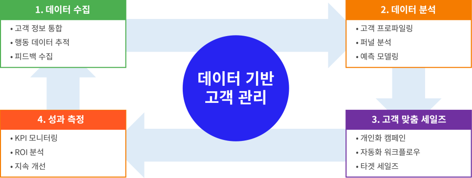 ์์ 3๊ฐ์ง ํต์ฌ ์์๋ฅผ ๊ธฐ๋ฐ์ผ๋ก ์๋์ ๊ฐ์ด 4๋จ๊ณ ํ๋ก์ธ์ค๋ฅผ ํตํด ๋ฐ์ดํฐ ๊ธฐ๋ฐ ๊ณ ๊ฐ ๊ด๋ฆฌ๊ฐ ๊ฐ๋ฅํฉ๋๋ค.